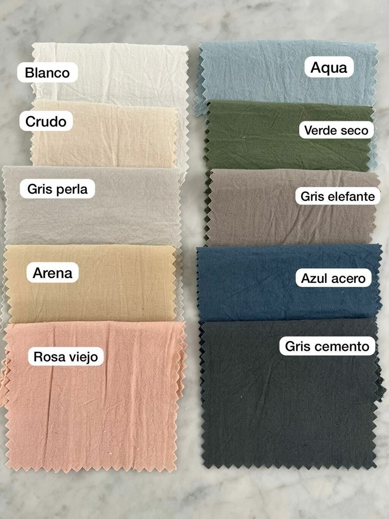 Colores disponibles: off white, crudo, arena, gris perla, rosa viejo, aqua, verde seco, azul acero, gris elefante y gris cemento.