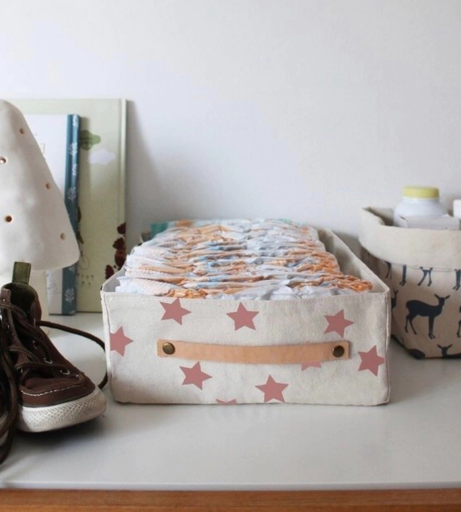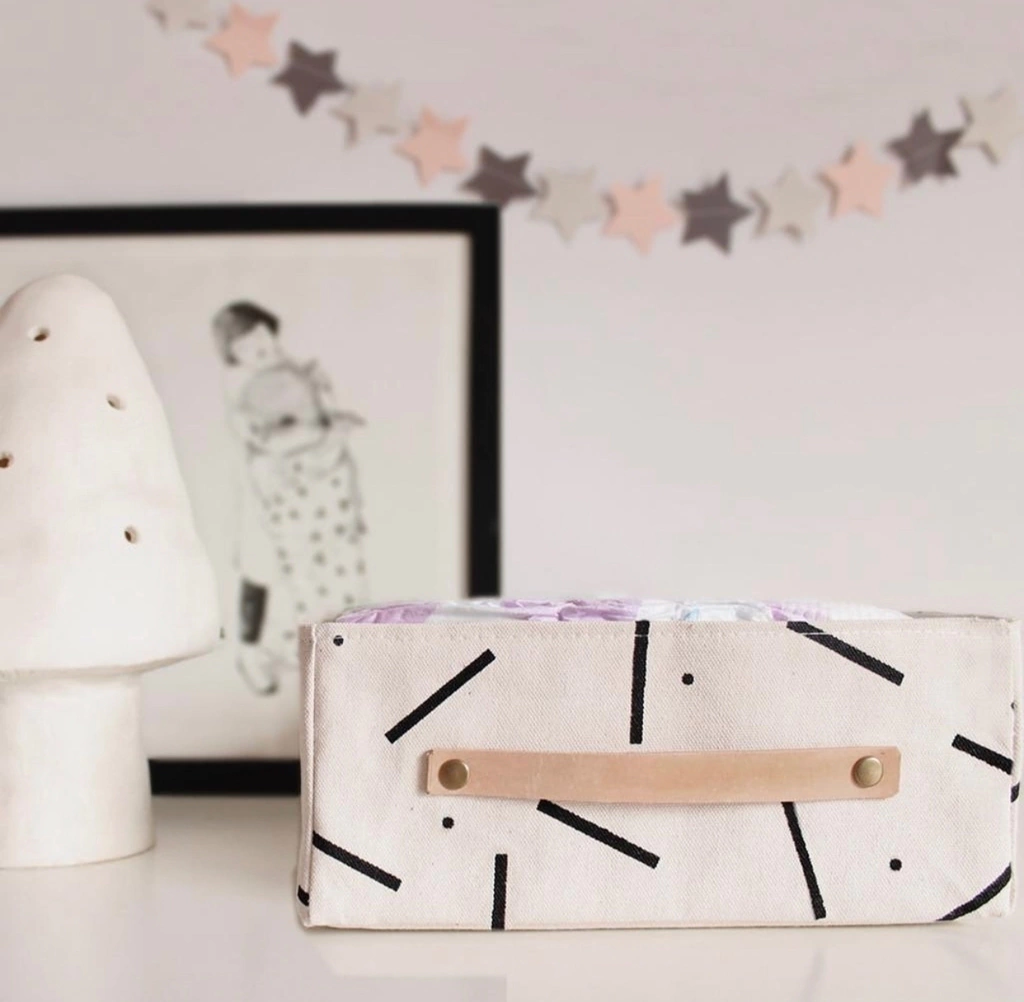 Caja contenedora realiza en género 100% algodón, estampada a mano mediante serigrafía.